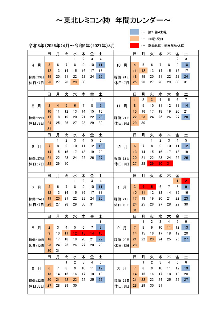2026.02.02 お知らせ 年間カレンダーについて(2026.4~2027.3)【東北レミコン株式会社】 今年4月からの【東北レミコン】年間カレンダーをお知らせ致します。 お客さまにおかれましては、工程検討の際などにご活用頂けますと幸いです。 PDF 記事一覧に戻る